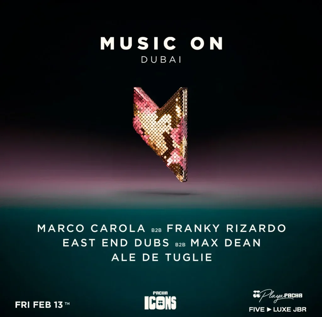 El 13 de febrero, la internacionalmente aclamada serie Music On regresa con un cartel compuesto por Marco Carola b2b Franky Rizardo, East End Dubs b2b Max Dean y Ale De Tuglie, quienes explorarán todas las vertientes del house y el techno.