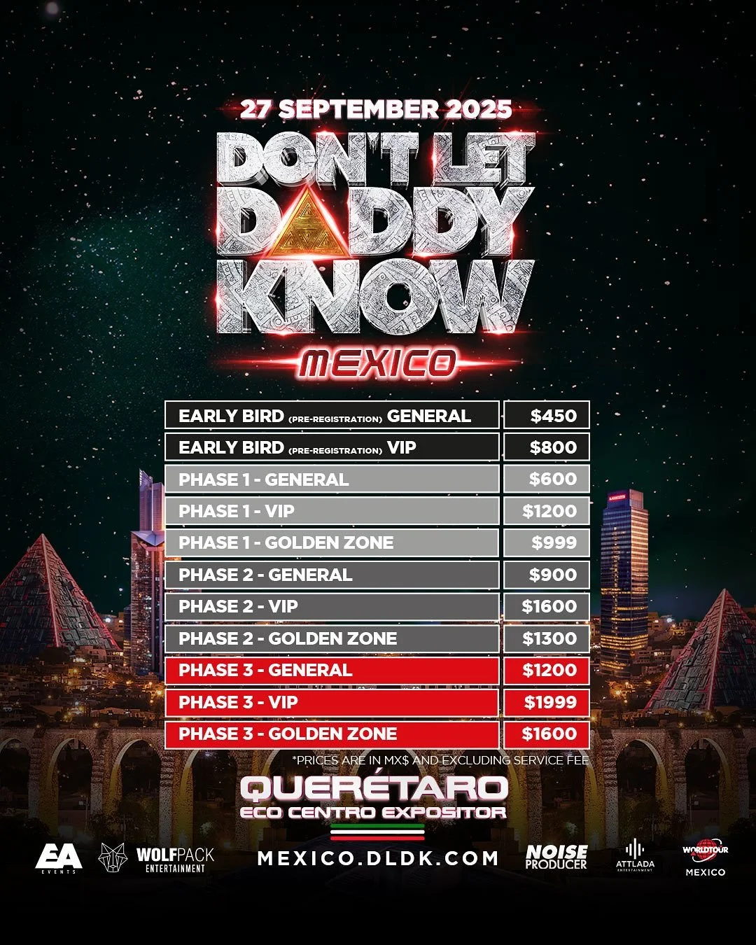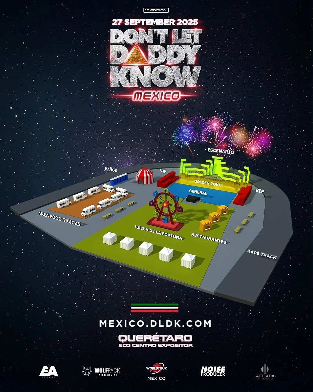 Conocido mundialmente por sus espectáculos inolvidables, sus imponentes escenarios y su poderosa sensación de unidad en la pista de baile, Don't Let Daddy Know finalmente trae su energía icónica a México. Esto es mucho más que una simple fiesta: es el comienzo de un emocionante y brillante nuevo capítulo para los amantes de la música electrónica. La primera edición de DLDK México promete un cartel explosivo con algunos de los mejores DJs del mundo, contará con food trucks variados, carpas de restaurantes exclusivos, una increíble rueda de la fortuna y una producción de primer nivel. Todo esto, combinado con una atmósfera electrizante y llena de buena vibra, hará que esta sea una de las experiencias de música electrónica más importantes, memorables e increíbles que hayan sucedido en México y a nivel mundial.